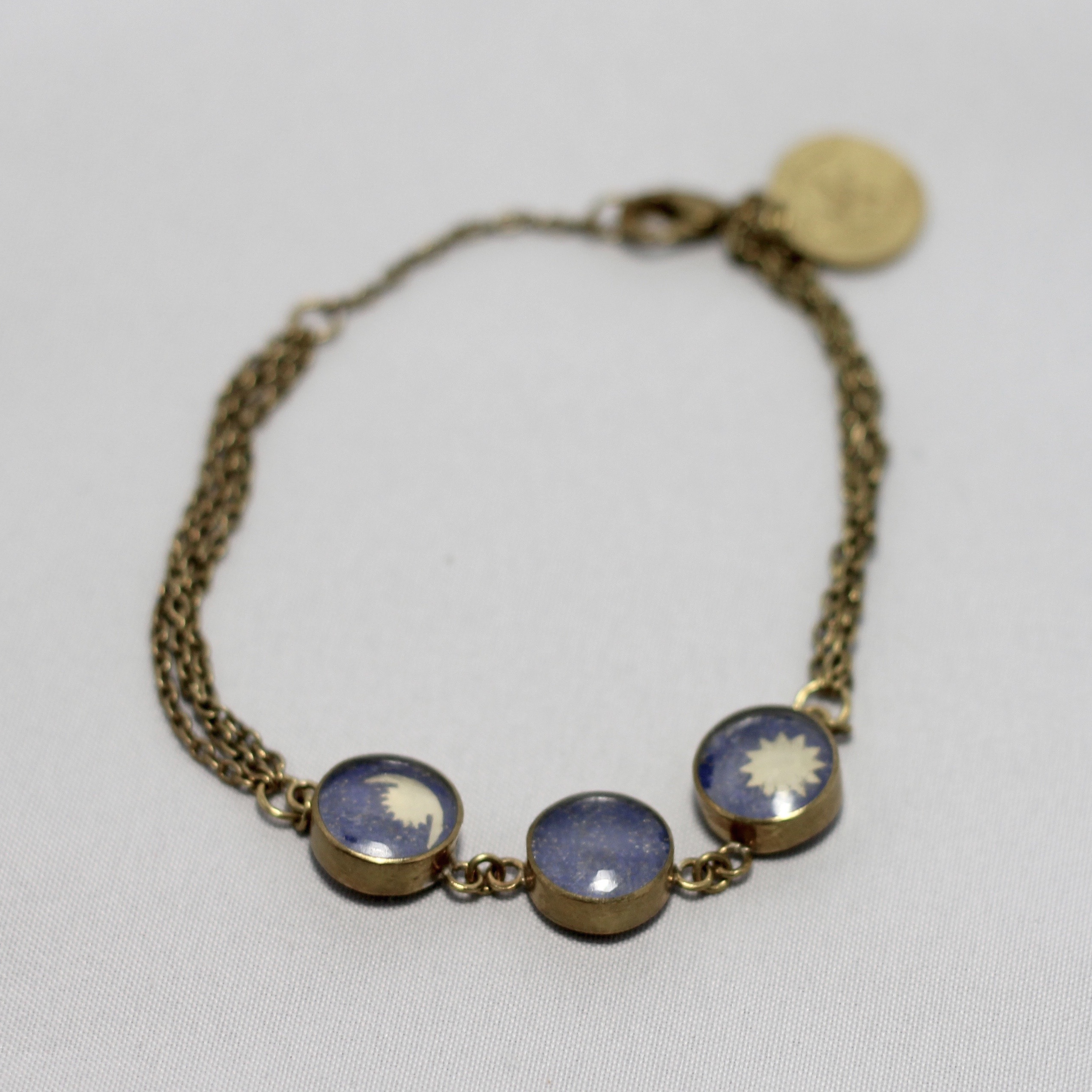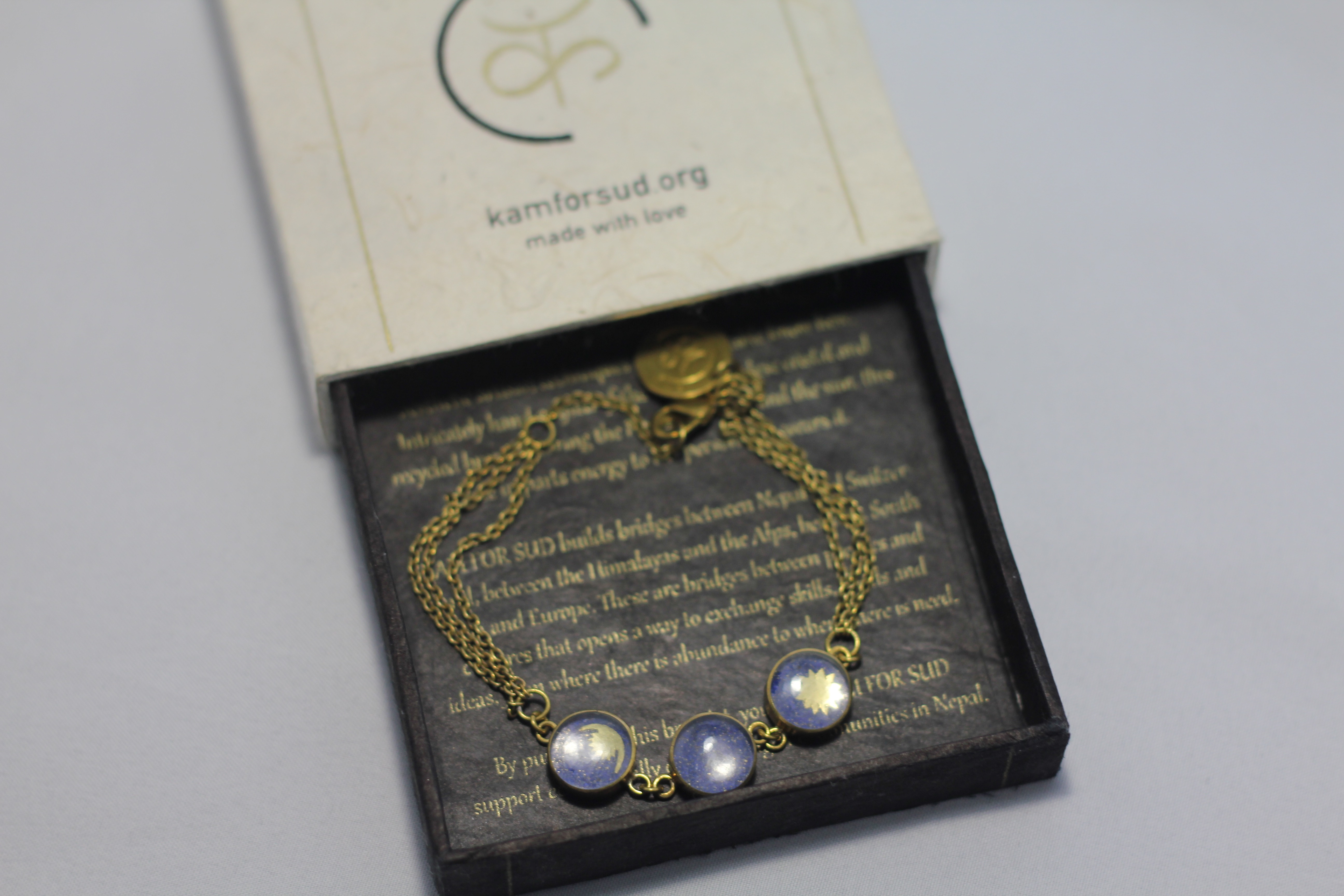 Shakti (“energy” in Nepalese) woman bracelet, made of recycled brass and Himalayan crystal, with a coral or a lapis lazuli basis and the image of the Nepalese sun and moon. From fair production in Nepal.